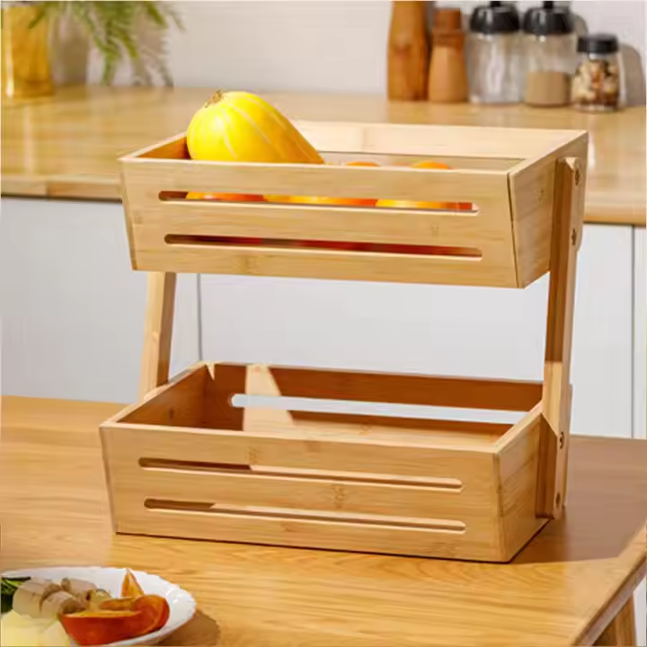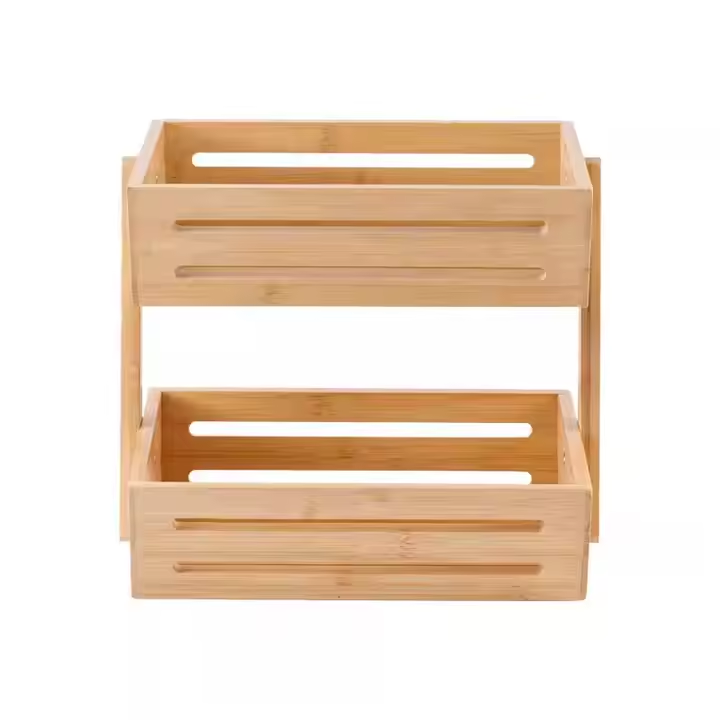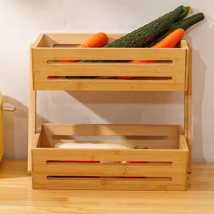 Bamboo Basket Vegetable and Fruit Food Store Shelf Organization Rack Wooden Kitchen Storage Two Layers